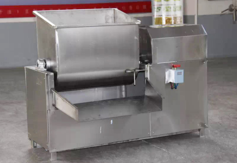 将加工出来的豆制品或面制品放入斗内,然后再放入食用油及麻辣配料,充分搅拌,使佐料均匀分布豆制品或面制品表面。